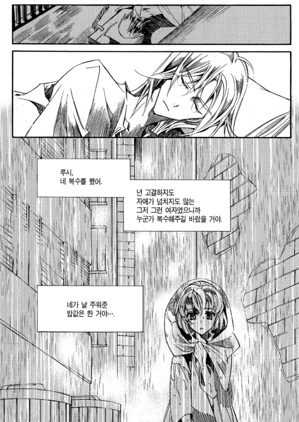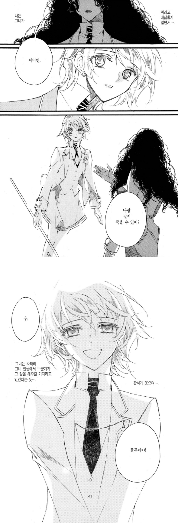 결국 크로히텐의 인류애와 라리에트의 대의가 만나 한 밀가루 반죽을 붕어빵으로 만든 이야기잖아! 커피우유신화인데 둘이서 만든 커피우유도 아니고 셋이서 만들었어요~. 하나만 남았어요(ㅠㅠ)라서 엔딩 이후에 느껴지는 공허함도 한몫한다. 이비엔은 자신의 공허를 라리에트로 메웠지만 독자인 전 어떡하냐고요? 엔딩이 마음에 드는 것과 별개로 아주 개운하지도 않아 생각나는 장면들이 있다.