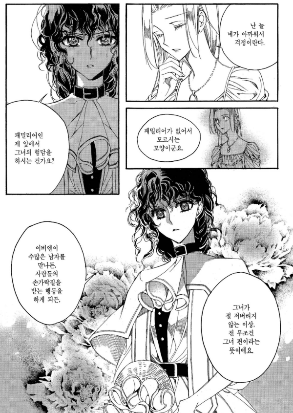 가장 좋아하는 캐는 라리에트 킹 다이아몬드. 괴력을 지닌 무도파 집안에 아름다운 외모, 문무겸비, 올바른 이념. 말그대로 다이아몬드를 깎아서 만든 캐릭터 같다. 초반에는 경쟁심을 불태우며 라이벌 포지션을 자처하지만 이비엔과 패밀리어로 엮이며 성장하는 모습을 보이다가 상당히 긴 후반부를 이비엔 없이 홀로 보내고 끝내 처참한 죽음을 맞이하게 되는데 (…) 읽을 당시의 내가 어리기도 했지만 이 행보를 받아 들일 수 없었기에 접은 거기도 하다. 이 둘의 호시절이 언제인가요? 라고 묻는다면 나는 이거.